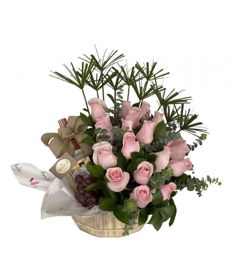 (Detalle producto: Vino Rosé Frontera Concha y Toro, Chocolates Ferrero Rocher 4 unidades, racimo de uvas)